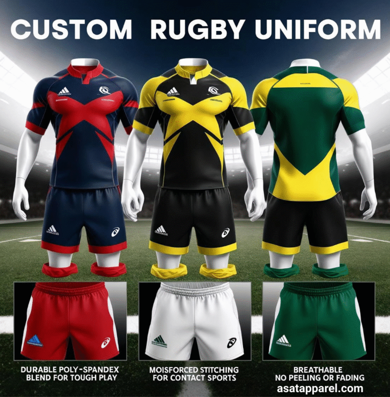 ASAT Apparel International Industries is a leading custom rugby uniforms manufacturer, specializing in personalized rugby jerseys, shorts, and team kits. We provide fully customized rugby uniforms tailored to your team’s branding, colors, and performance needs. Whether you need sublimated rugby jerseys, embroidered logos, or moisture-wicking fabrics, we deliver premium-quality rugby teamwear for clubs, schools, and professional teams worldwide.